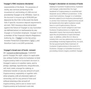 It's surreal to see how much of this info is hidden in plain sight in Voyager's customer agreements (including everything Metro said). And the most vague disclaimer of all time about what happens to crypto deposits in event of Voyager insolvency. https://investvoyager.com/useragreement/