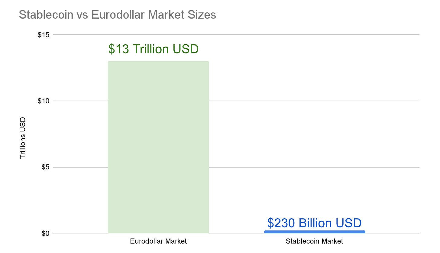 In a world where crypto has struggled to find use cases1 , stablecoins have an obvious one: competing with the Eurodollar market. These are dollars held outside of the US (not necessarily in Europe, despite the name) that help facilitate offshore borrowing, lending, and transactions in US dollars. At nearly $13 trillion US dollars today, this market shows the massive demand to use dollars outside the US. The stablecoin market today is comparatively tiny at ~$230b, 99% of which are stablecoins pegged to the US dollar.