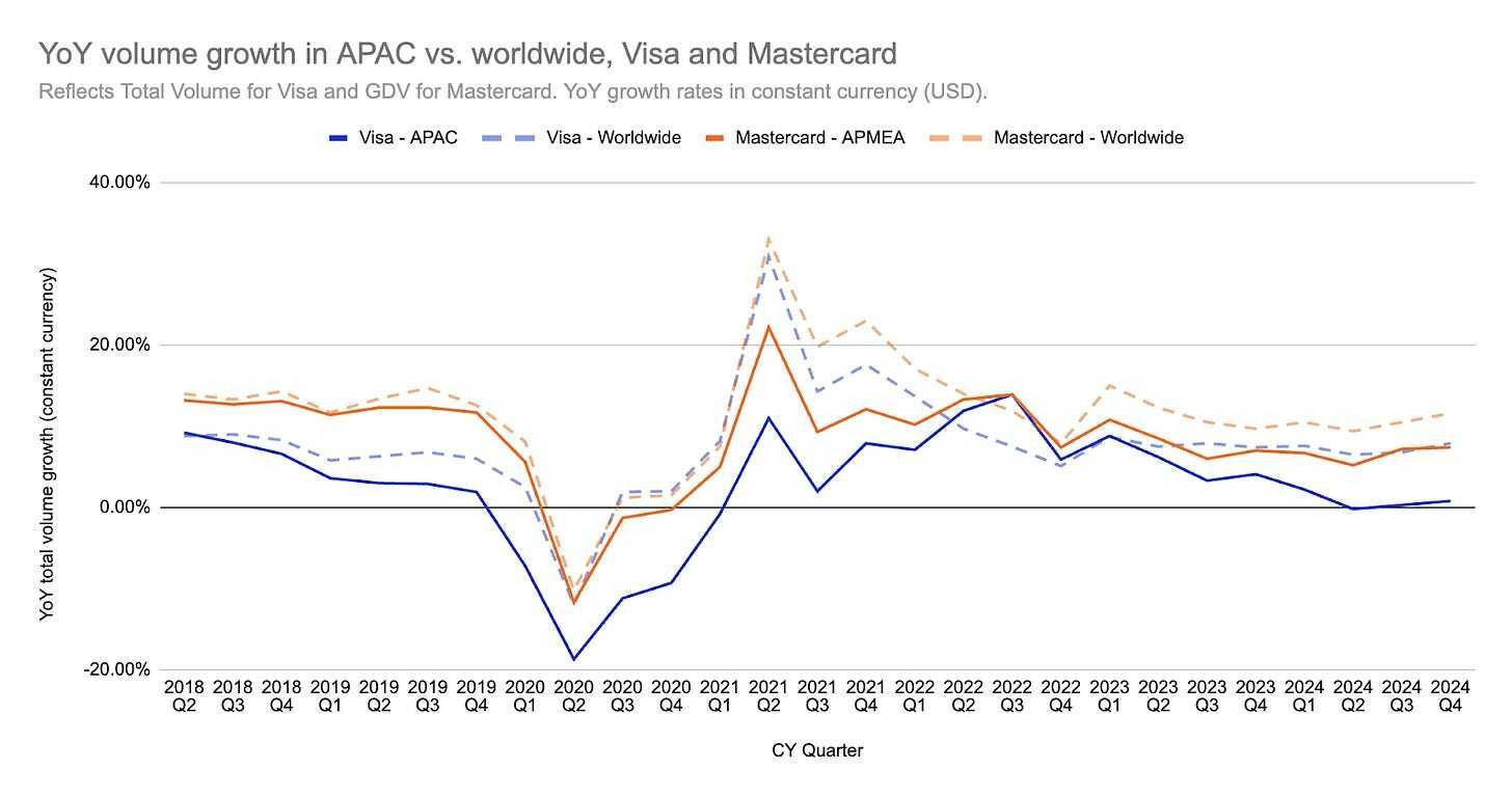 This chart focuses on quarterly growth rates for Visa and Mastercard, with special attention on APAC (Asia‐Pacific). These networks have long been viewed as unstoppable growth machines—both typically report steady double‐digit volume increases year after year. And while this is still happening at the worldwide level, Visa started to see a meaningful dip in APAC in 2H24 to ~0% growth.