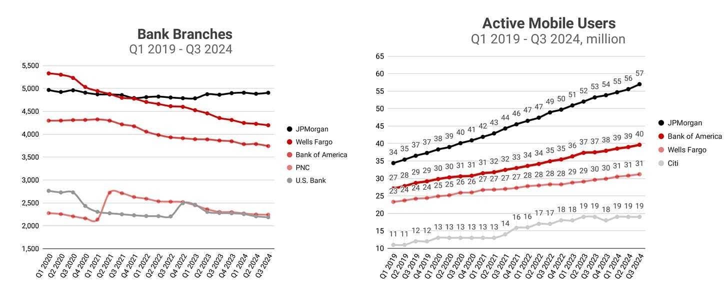 We’ve seen a massive consolidation in commercial banks in the last 3 decades, going from ~14,500 in 1985 to ~4000 today. Among the largest banks still around, we’ve seen a decline in bank branches since COVID (except for JP Morgan) and a huge rise in active mobile users (and deposits).