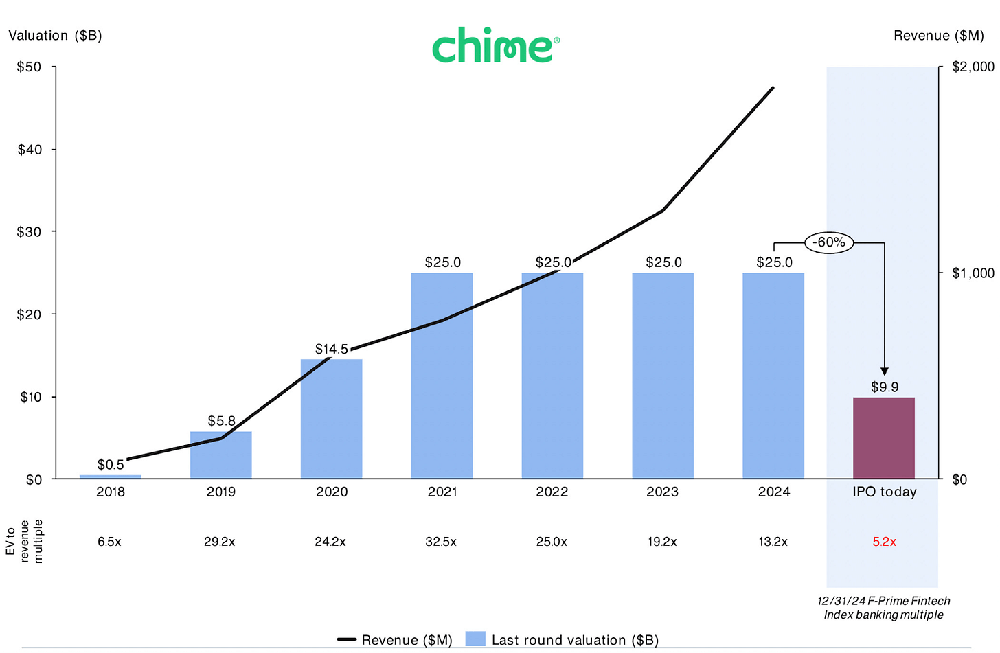 At the same time, Ramp recently raised at ~20x revenue multiple, and Stripe is raising at a similar one. They fundamentally have similar business models to Chime today (fees on interchange), but both also have grand long-term visions and Ramp is growing significantly faster than Chime (albeit at a lower base). So there still seems to be room for some fintech companies to earn “tech” like multiples with the right pitch, at least in private markets right now.