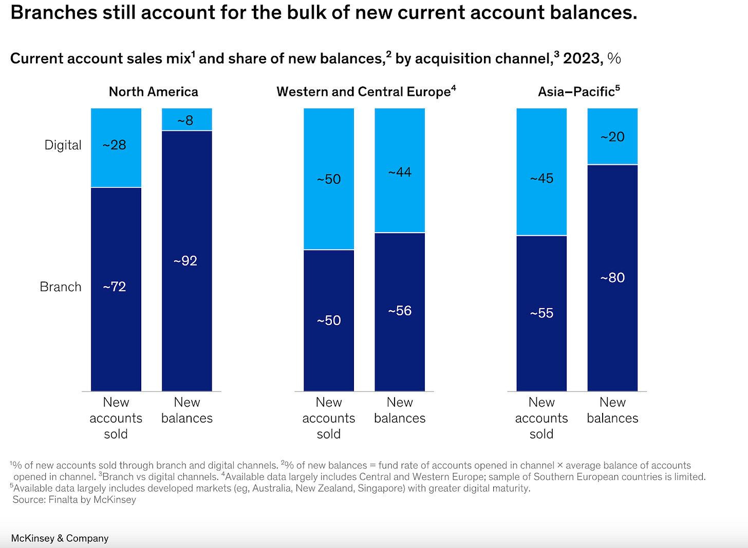 … a shocking amount of new deposits still come from branches! In North America, 72% of new accounts are sold through branch channels, bringing in 92% of all new dollars. I was personally surprised by this. I understand some things are better to go into a bank branch, but it feels like you can do almost anything digitally today. In-person trust still matters, and I’m an out-of-touch coastal millennial I suppose.