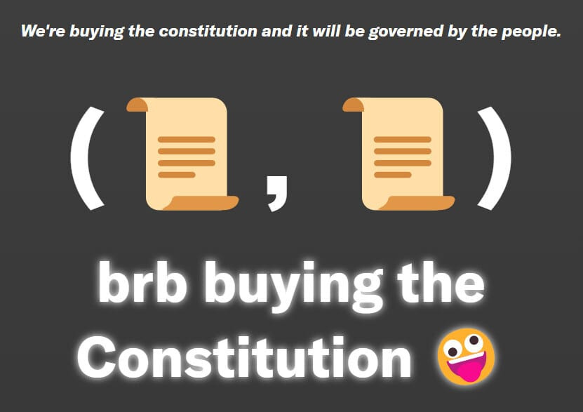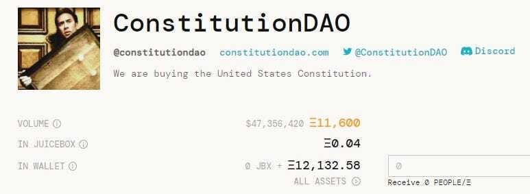 @ConstitutionDAO is just a group of people with a shared wallet who wanted to crowdfund a bid to buy a copy of the Constitution at Sotheby's ("the project").